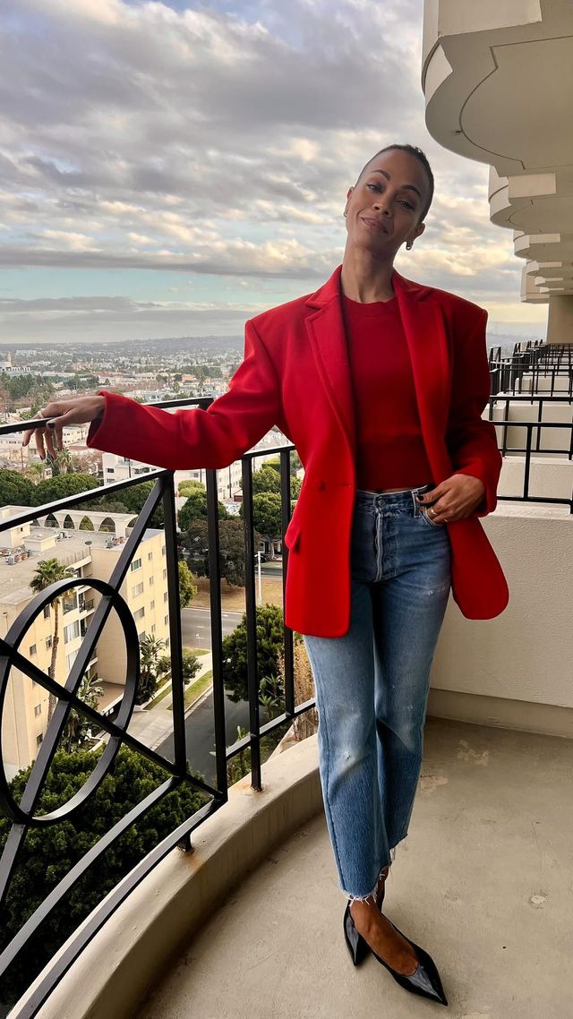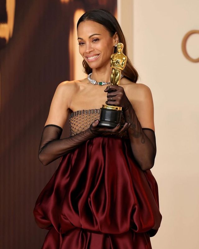 오스카 트로피를 들던 순간엔 메시 톱이 더해진 볼륨감 있는 버건디 드레스를 입었고, 골든글로브 시상식에서는 깊은 컬러와 절제된 실루엣으로 고전미를 드러냈습니다. 스팽클로 위트를 더한 레드 룩도 있죠. 어떻든 조 샐다나는 같은 빨강은 절대 반복하지 않습니다.