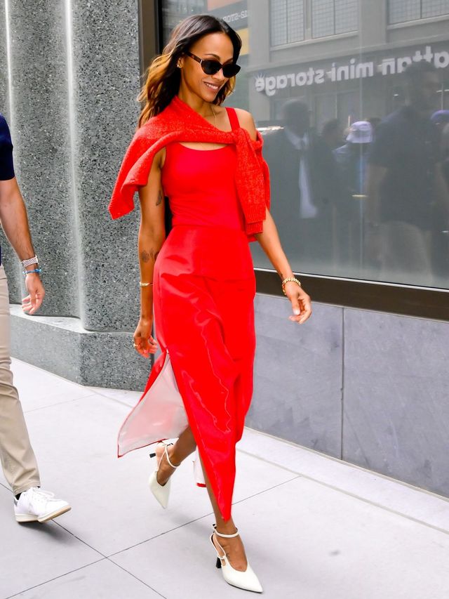 뉴욕을 뜨겁게 달군 조 살다나의 룩도 빠질 수 없습니다. 슬릿 디테일의 레드 탱크 드레스 위에 니트를 툭 걸친 채 등장해 수많은 파파라치 컷을 양산했거든요.