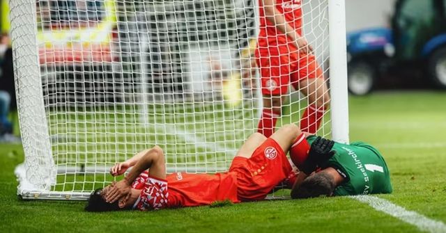 골대와 충돌해 쓰러진 이재성(가운데) / 마인츠 홈페이지