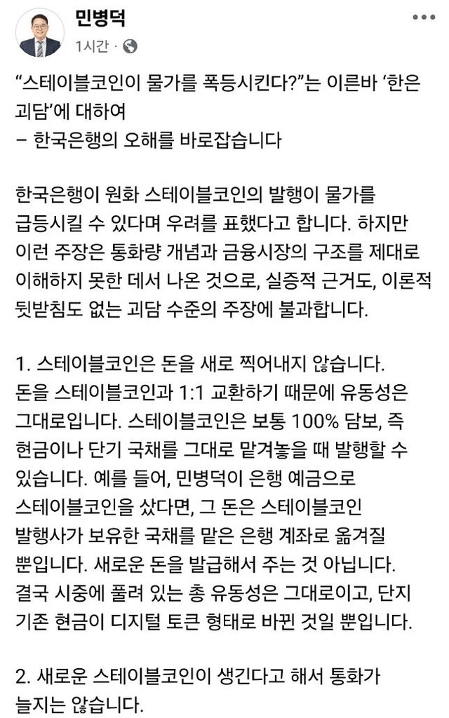 민병덕 의원은 28일 페이스북에 게재한 글에서 “한국은행이 원화 스테이블코인의 발행이 물가를 급등시킬 수 있다며 우려를 표했다고 한다”며 “이런 주장은 통화량 개념과 금융시장의 구조를 제대로 이해하지 못한 데서 나온 것으로, 실증적 근거도, 이론적 뒷받침도 없는 괴담 수준의 주장에 불과하다”고 설명했다.