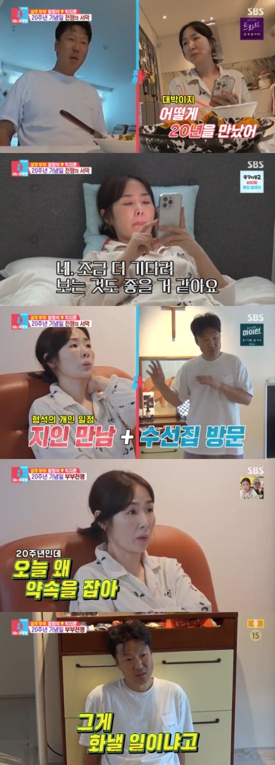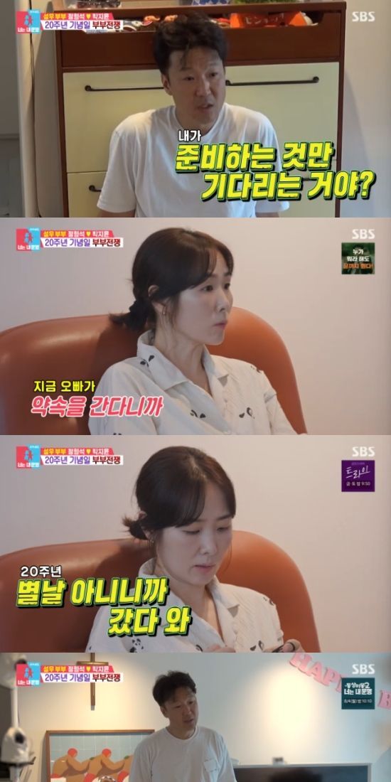 박지윤은 "대신 나는 자기 선물을 사줬잖아"라고 했고, 정형석은 "내가 51살인데 나가는 걸 그렇게 허락 받아야 해?"라고 언짢아했다. 서운해진 박지윤은 "그냥 가라. 20주년 별날 아니니까 다녀와"라고 비꼬았다.