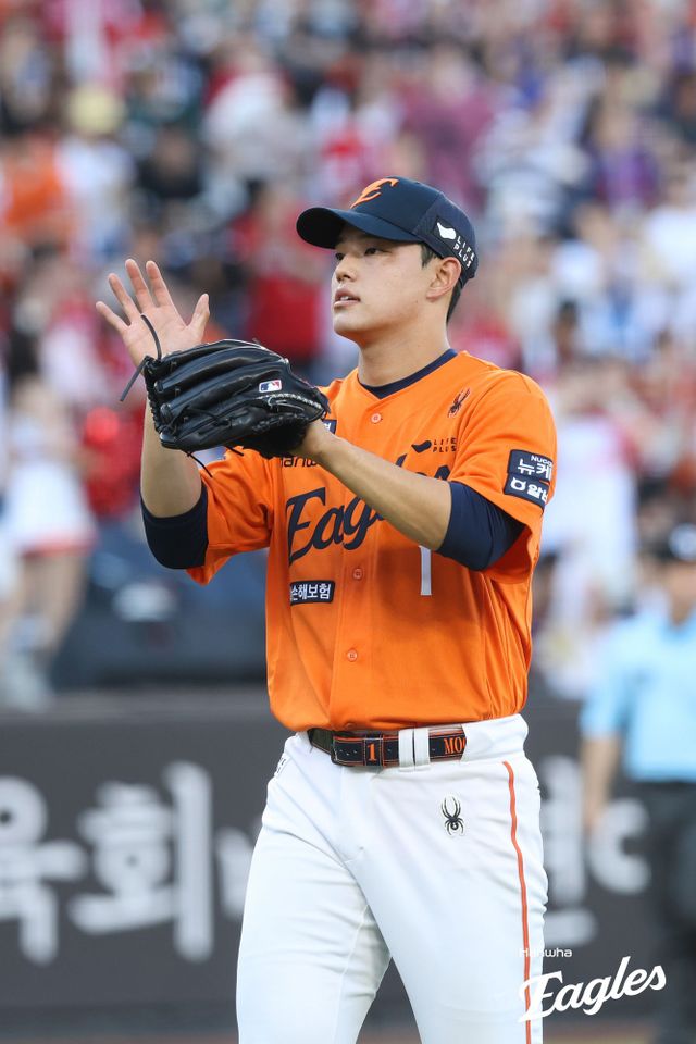 4회초 선두 최정에게 152km/h 직구를 던졌다 홈런을 맞은 문동주는 에레디아를 흔들리지 않고 3구삼진으로 돌려세운 뒤, 고명준과 김성욱을 모두 초구에 범타 처리했다.