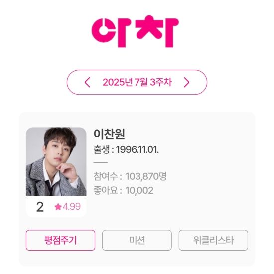 '찬또배기' 이찬원, 180주 연속 아이돌차트 평점랭킹 TOP2