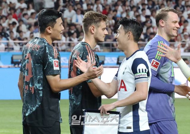 잉글랜드 프리미어리그(EPL) 토트넘 홋스퍼와 독일 분데스리가 바이에른 뮌헨의 2024쿠팡플레이시리즈 2차전이 3일 오후 서울 마포구 서울월드컵경기장에서 열렸다. 경기 전 김민재와 손흥민이 반갑게 인사하고 있다. 상암=김민규 기자 mgkim1@edaily.co.kr /2024.08.03/