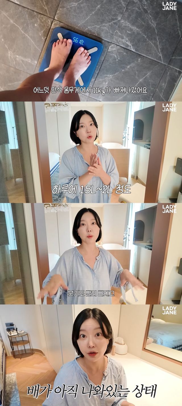 이어 레이디제인은 부기를 빨리 빼기 위한 팁은 공개했는데 "물을 많이 마시는 게 진짜 중요하다. 하루에 1.5L~2L. 좀 과하다 싶을 정도로 많이 마셔줘야지 부기도 빨리 빠지고 오로 같은 것도 배출이 잘 된다"라며 "결국에는 부종이 빠져나가는 방법이 땀이랑 소변밖에 없다. 그래서 계속 배출해 주기 위해서 물을 많이 마셔야 한다"라고 설명했다.