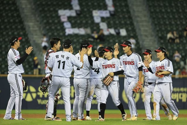 29일 오후 서울 송파구 잠실야구장에서 열린 프로야구 '2025 신한 SOL뱅크 KBO 리그' KT 위즈와 LG 트윈스의 경기에서 승리를 거둔 LG 선수들이 자축하고 있다. / 뉴스1