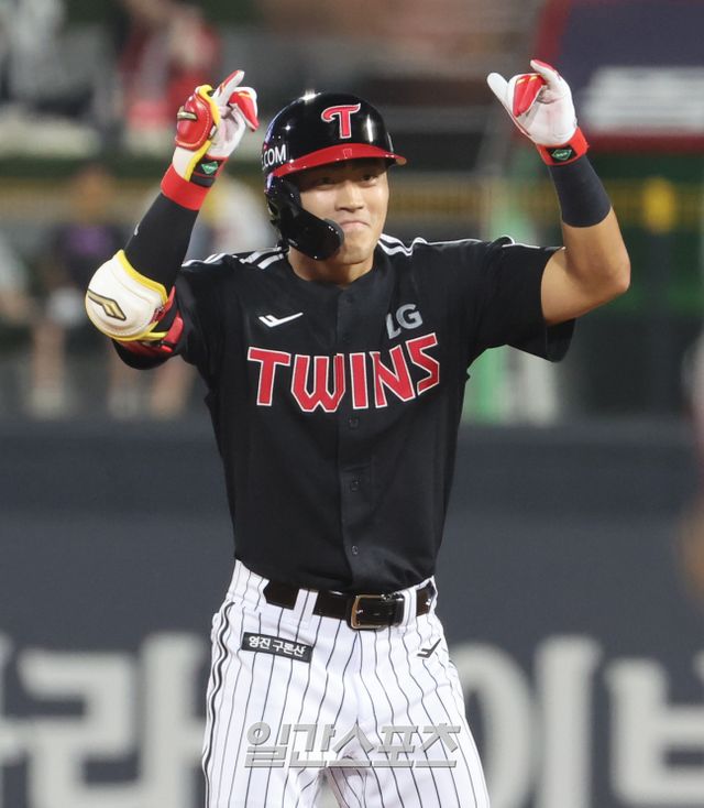 26일 오후 수원 KT위즈파크에서 열린 2025 프로야구 LG와 KT 경기. LG 천성호가 9회 선두타자로 나와 우중간 2루타를 기록한 뒤 기뻐하고 있다. 수원=정시종 기자 /2025.06.26.