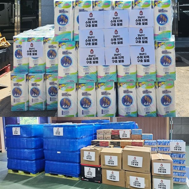 경남FC는 산청군에 식음료를, 합천군에는 두루마리 휴지 등 6,000개에 달하는 물품을 전달했다. 해당 물품은 수해로 피해를 입은 이재민뿐 아니라 복구 작업에 투입된 자원봉사자들에게도 함께 전달될 예정이다.