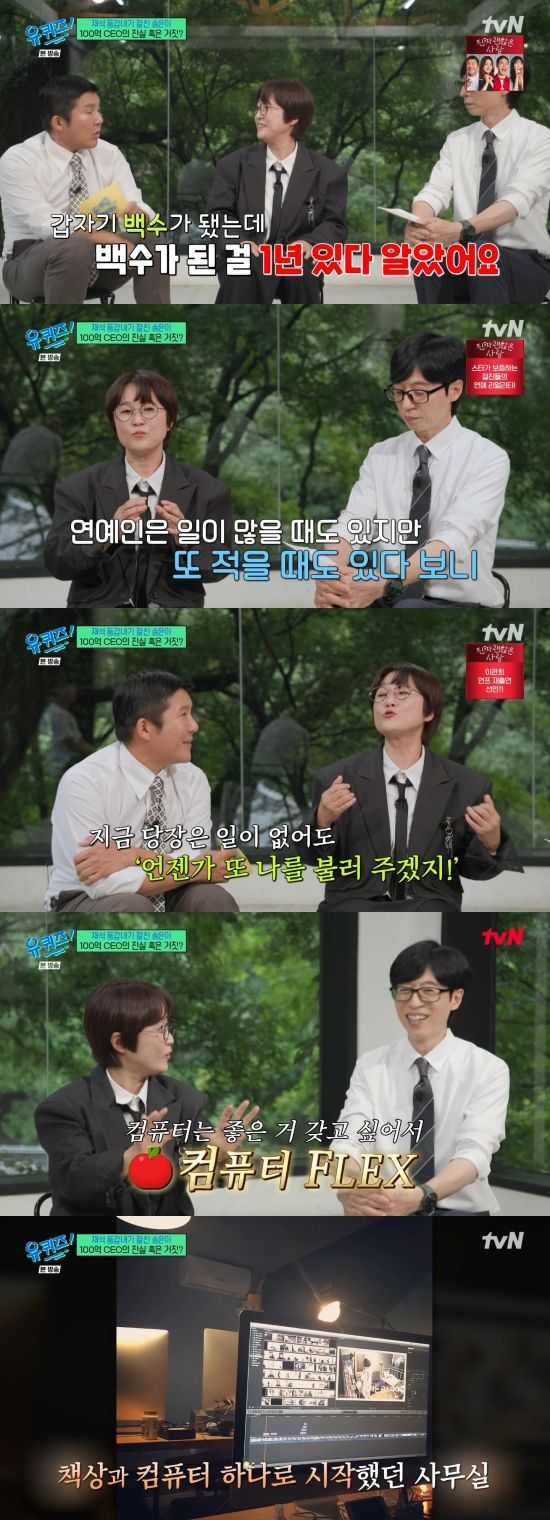 유재석은 "제가 사무실 갔던 거기이지 않냐. 홍대에 있는. 여기서 월월세로 시작한"라며 거들었고, 송은이는 "제 친한 뮤직비디오 감독님이 사무실을 갖고 있었고 편집실을 갖고 있었는데 한편에 '언니 백수 됐으니까 책상 하나만 놓을게' 해서 가서 책상 하나 놓고 의자 하나 놓고 뭣도 모르는데 컴퓨터는 좋은 거 사고 싶어서 애플 컴퓨터 하나 놓고"라며 설명했다.
