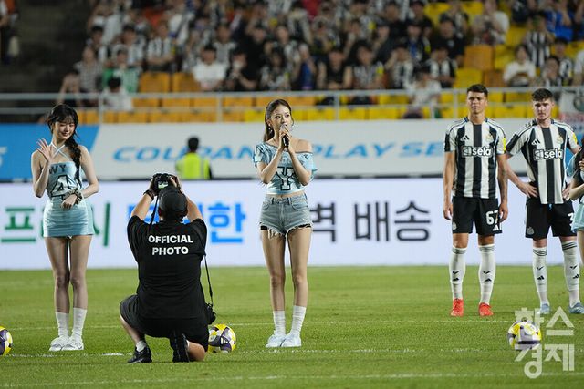 걸그룹 아이브(안유진, 가을, 레이, 장원영, 리즈, 이서) 안유진이 30일 오후 수원월드컵경기장에서 열린 2025 쿠팡플레이 시리즈 1차전 팀 K리그 대 뉴캐슬 유나이티드 FC와의 경기서 시축전 인사말을 하고 있다. /수원=최대성 기자 dpdaesung@sporbiz.co.kr 2025.07.30.