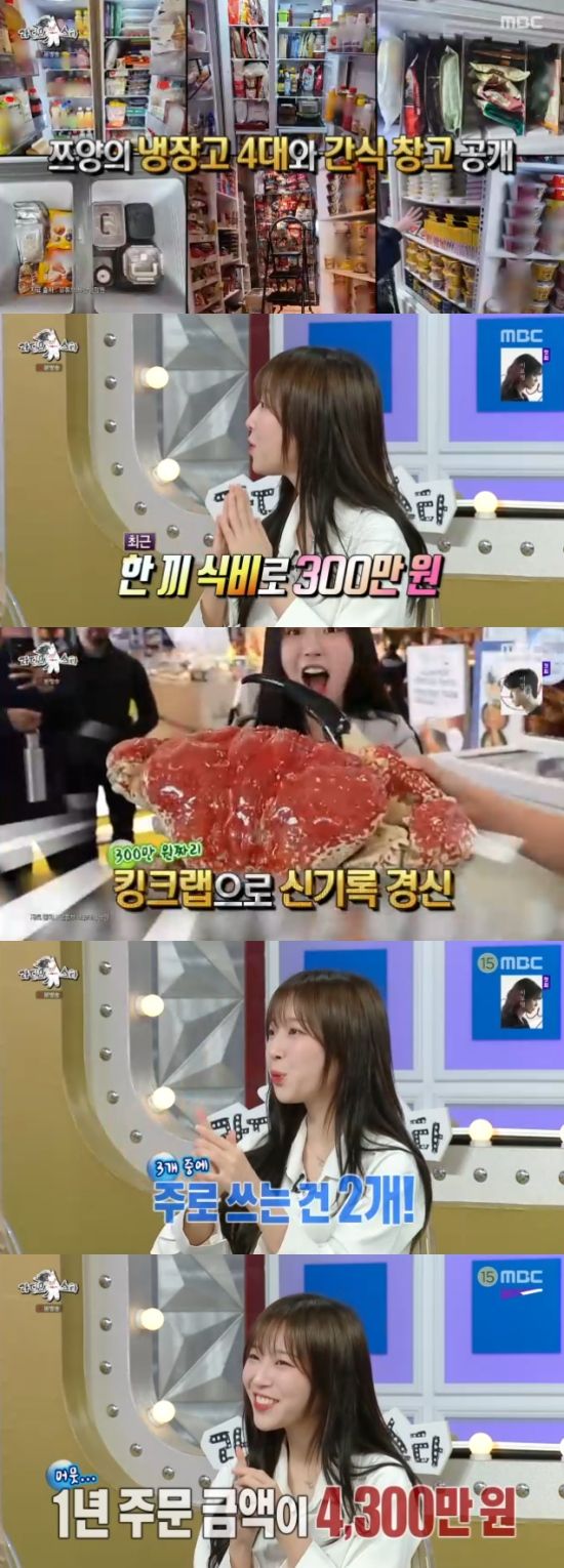 이에 MC들은 쯔양의 1년 식비를 궁금해했고, 쯔양은 "배달 어플 1개에서 1년 주문 금액이 4300만원이었다. 배달 음식이 문 앞에 여러 개 쌓여있을 때도 있다"면서 "식비가 많이 나간다. 한끼에 300만원을 쓰기도 했는데. 킹크랩 16.3kg정도 먹었었다"고 말해 놀라움을 자아냈다.