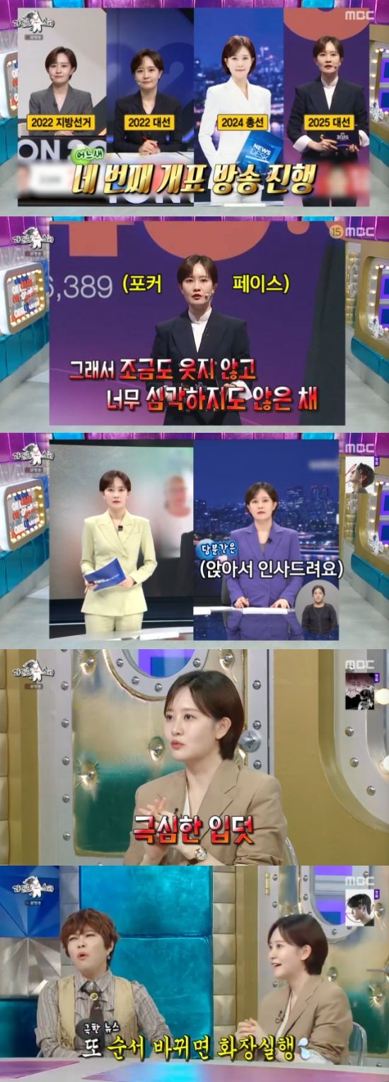 이날 '신뢰도 1위' 앵커 김수지가 최근 대선 방송을 언급했다. 김수지는 "선거방송은 4번째 경험이다. 가장 신경이 많이 쓰이는 부분은 조금이라도 (특정 후보의 상황에) 웃기라도 하면 누구를 지지한다고 말할까봐 신경이 쓰였다. 조금도 웃지 않고, 조금도 심각하지 않게 진행을 했다. 저희는 리허설을 할 때도 특정 후보를 염두에 두지 않고 연습을 했다"고 말했다.
