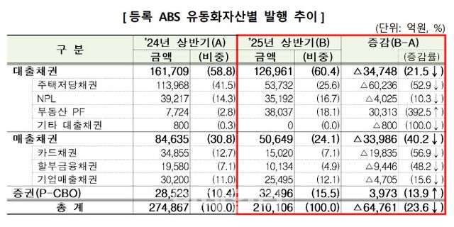 금융감독원이 31일 발표한 ‘2025년 상반기 등록 ABS 발행 실적’에 따르면, 올해 상반기 등록 ABS 발행액은 21조원으로 전년 동기(27조5000억원) 대비 6조5000억원(23.6%) 감소했다. 등록 ABS는 계획 등록을 마친 상품을 뜻한다.