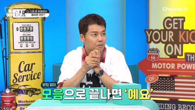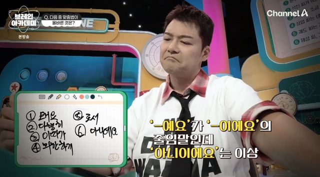 다만 맞춤법 퀴즈에선 조마조마한 모습으로 웃음을 자아냈다. 신영일은 전현무의 답지를 보고는 “고민한 흔적이 역력하다”고 꼬집었다. 전현무는 “‘~에요’와 ‘~예요’가 늘 헷갈린다. 아니예요는 아니+이에요의 줄임말이라 뭔가 이상해 ‘아니에요’를 택했다”며 “솔직히 지금도 헷갈린다”고 털어놨다.