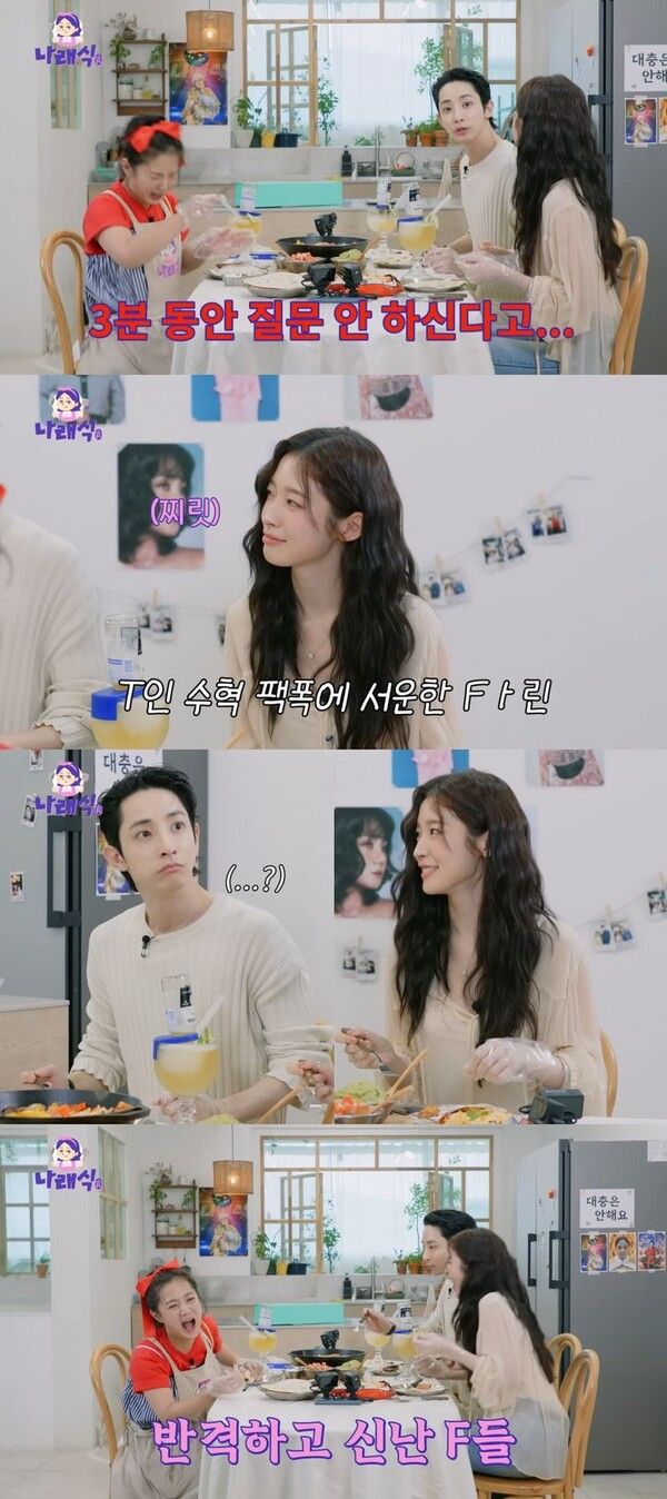 이수혁에게 반격한 박나래와 아린은 즐거워했다. T성향의 이수혁과 F성향의 박나래·아린의 상반된 반응이 웃음을 유발했다.