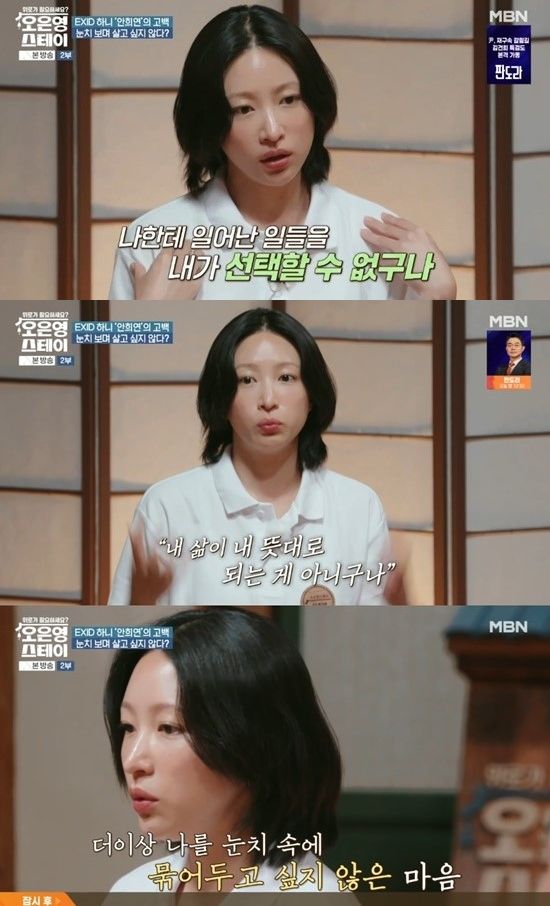 방송에서 하니는 "눈치를 보는게 힘든데 눈치를 자꾸 봐야하는 환경 속에 있었다. 그러면서 최근에 이런저런 일들을 겪었다. 나한테 일어난 일들을 내가 선택을 할수가 없구나"라며 "그러면서 제 사람에 대해서 통제를 하고 싶은 마음이 자연스럽게 내려놓게 됐다"라고 솔직하게 심경을 고백했다.