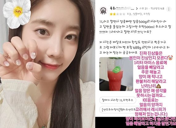 손님은 "1L라고 팔면서 얼음 빼면 얼음 500g이 사라진다는 답변을 들었는데 그럴거면 수박 500ml 주스라고 팔아야지, 1리터라고 팔면 사기 아닌가요?"라며 1L 컵에 반만 담긴 수박주스 사진을 첨부했다.