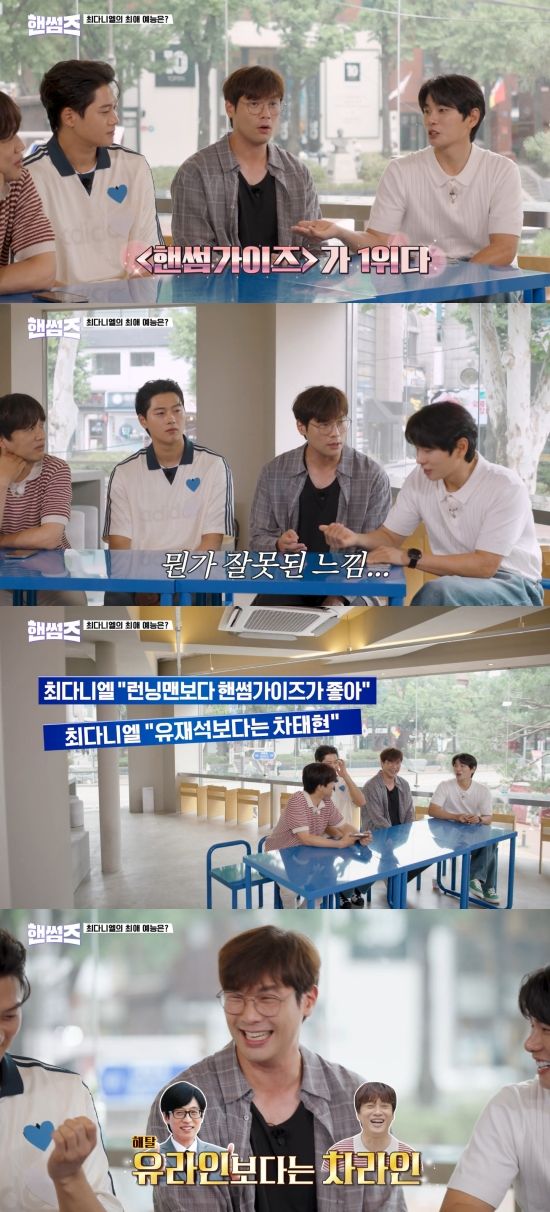 이이경은 "헤드라인 뽑기가 너무 좋다. 최다니엘 예능 중에 '핸썸가이즈'가 제일 재밌어"라며 너스레를 떨었고, 차태현은 "유재석보다 차태현"이라며 덧붙였다. 최다니엘은 "차라인?"이라며 재치 있는 입담을 뽐냈다.