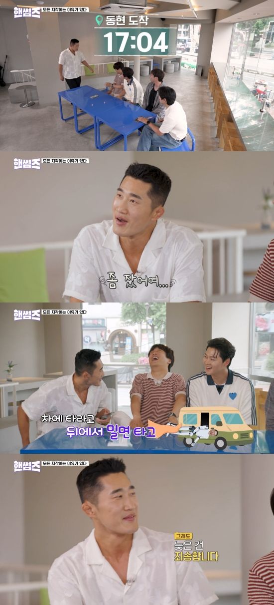 차태현은 "왜 늦었냐니까"라며 추궁했고, 김동현은 "(내가) 늦었냐. 저는 사이보그라고 생각하면 된다. 차에 타라고 누가 밀면 타고 발로 차서 내리라면 내리고 올라가라면 올라가고 내릴 때 이야기하더라. '빨리 뛰어가세요' 해서 빨리 뛰었다. 죄송하다. 늦었다"라며 변명했다.