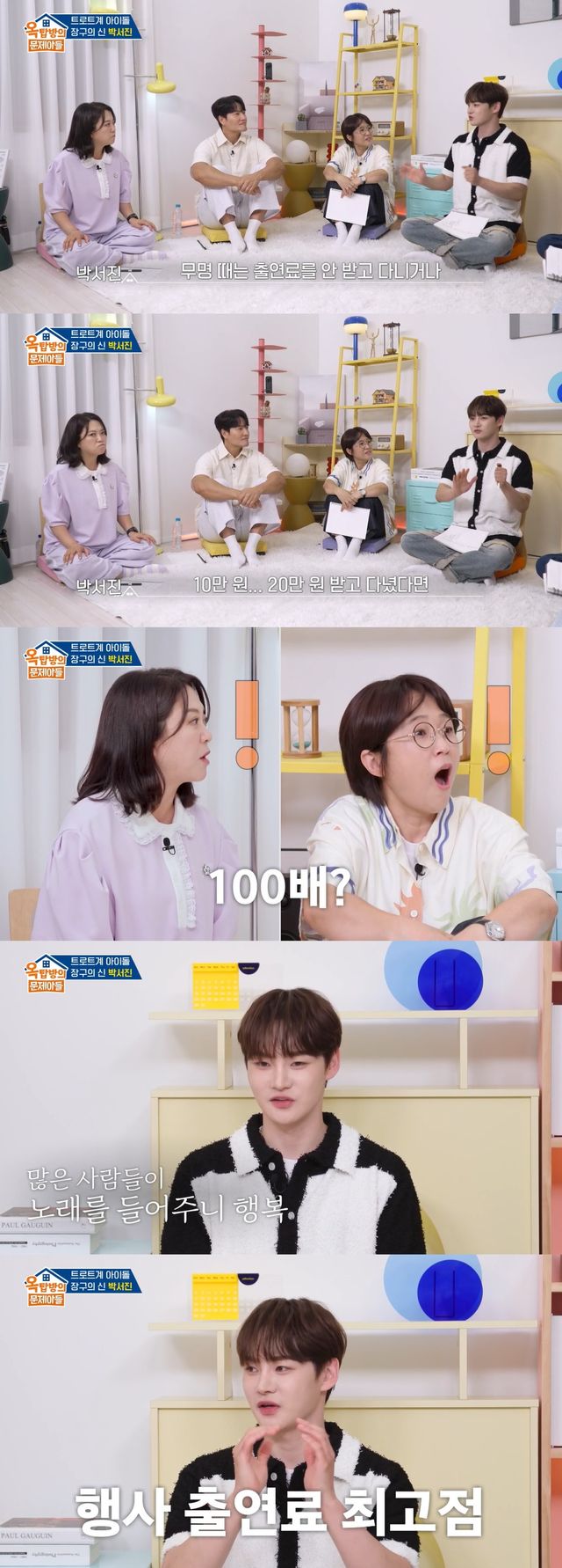 (엑스포츠뉴스 우선미 기자) 가수 박서진이 출연료가 100배 올랐다고 밝혔다.