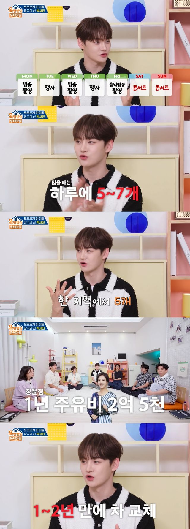 특히 박서진은 "지금은 스케줄을 조정하고 있는데 정말 많았을 때는 하루에 5개에서 7개까지 한 적이 있다"라며 "아침에 마라톤 행사부터 시작해서 7시부터 시작해서 장구 치면서 노래를 부르고 지역 행사를 뛰고 밤 행사까지 뛰면 6개~7개다"라고 말했다.