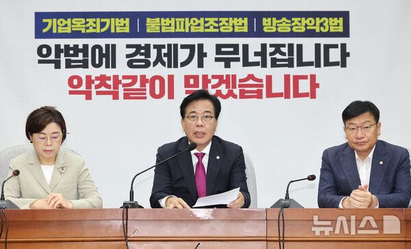 뉴시스 보도에 따르면, 송언석 비상대책위원장 겸 원내대표는 이날 오전 국회에서 열린 원내대책회의에서 "정부는 세수결손과 재정 여력 확보를 이유로 내세우고 있지만 실상은 우리 기업을 또다시 옥죄는 세금폭탄"이라며 이같이 말했다.