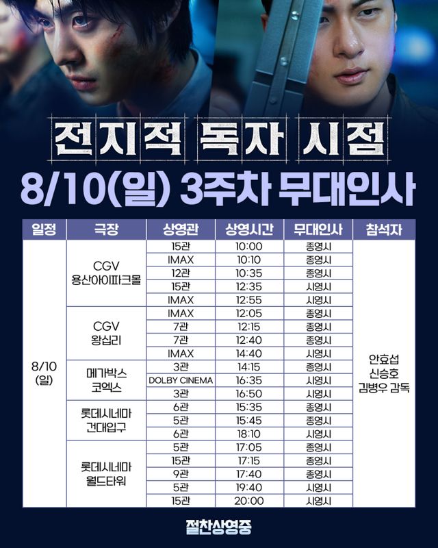 1일 배급사 롯데엔터테인먼트에 따르면 영화 ‘전지적 독자 시점’의 주역 안효섭, 신승호, 김병우 감독은 오는 10일 무대인사에 참석한다.