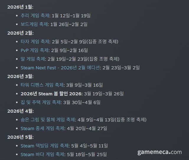 주기적인 할인 판매로 게이머의 지갑을 위협하는 밸브의 스팀이 올해 하반기를 넘어 내년 상반기 일정도 준비 중이다. 스팀 넥스트 페스트, 봄 할인 등 정기 할인을 포함해 1월부터 5월까지 예정된 것만 13종이다.