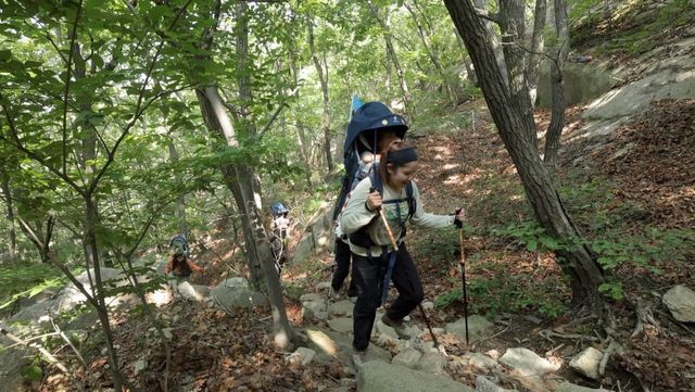 아기 몸무게 10kg, 짐까지 합하면 총 15kg 무게를 감당하며 오르는 산행이지만 엄마들의 얼굴엔 오히려 생기가 가득하다!