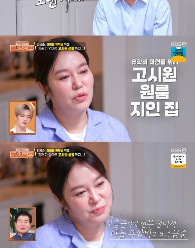 그렇게 김금순은 아들의 유학으로 인해 기러기 엄마 신세를 지게 된 것. 그는 "고시원에 살고, 원룸에 살고, 아는 분 집에 얹혀살고. (보증금) 다 빼서 보냈다"며 유학비 마련을 위해 집은 전전했던 과거를 고백했다.