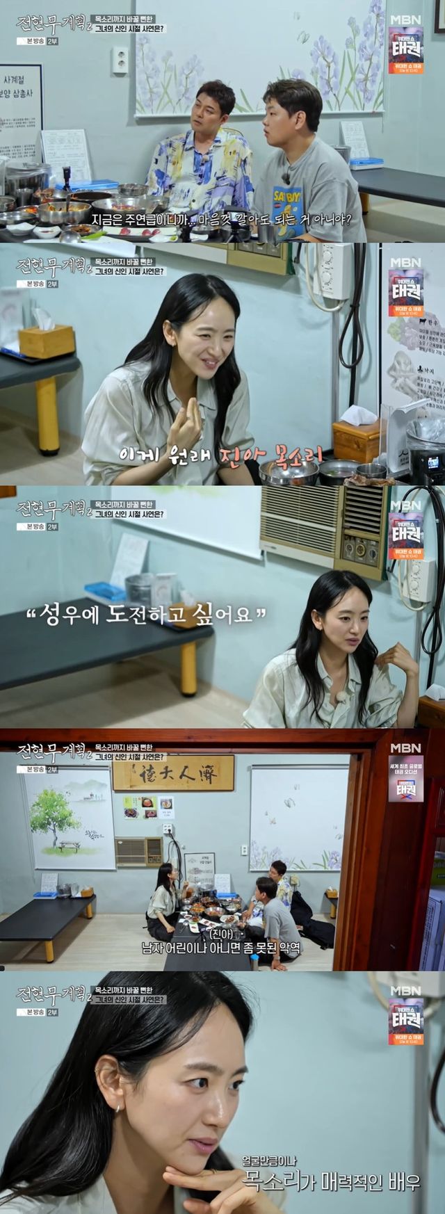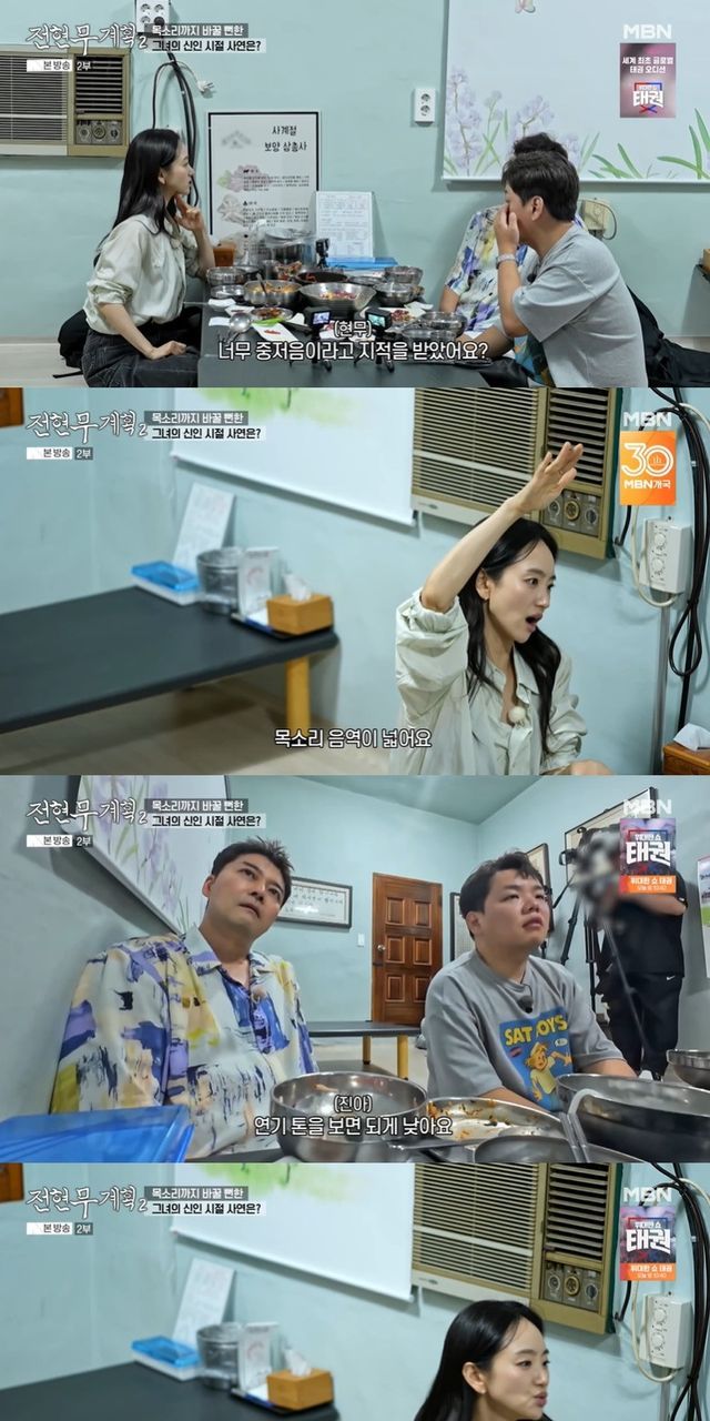 이날 전현무는 원진아에게 "데뷔 초에 목소리가 너무 중저음이라고 지적받았냐"고 물었다.