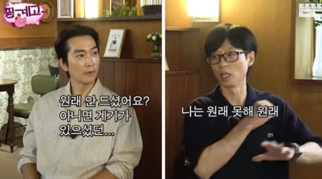 유재석은 술을 한 잔도 못한다고 고백했고 송승헌은 “원래 안 드셨나, 아니면 계기가 있으셨나”라고 질문했다. 이에 유재석은 “나는 원래 못 한다. 어릴 때 술을 먹으려고 몇 번 노력을 해봤는데 맛이 없더라. 일단 너무 쓰다”라고 고백했고 엄정화는 “얼마나 맛있는데!”라는 반응을 보였다.