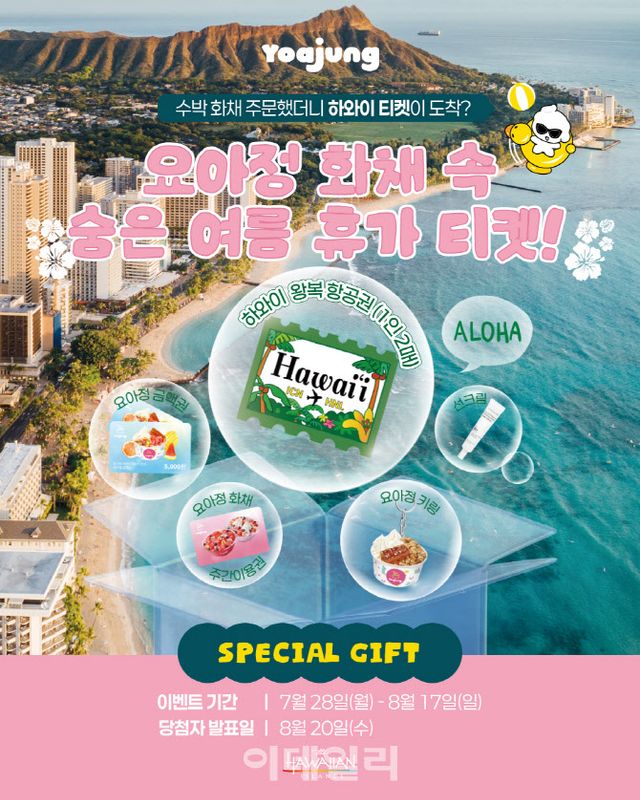 이번 이벤트는 이달 17일까지 진행된다. 요아정 매장 또는 배달 주문을 통해 ‘수박 화채의 정석’ 2종을 구매하면 응모 티켓이 제공된다. 티켓의 QR코드를 통해 응모를 완료하면 추첨을 거쳐 하와이 왕복 항공권(1인 2매)을 비롯해 요아정 화채 주간 이용권, 요아정 금액권, 선크림, 요아정 키링 등 다양한 경품이 증정된다. 당첨자는 8월 20일 개별 발표된다.