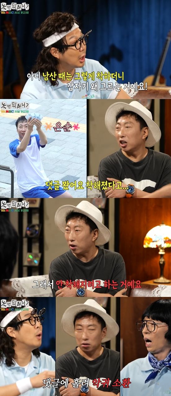 하하가 "남산 때는 그렇게 착하더니 갑자기 왜 이러는 거냐"라며 당혹감을 숨기지 못했다. 박명수는 "'착해졌다'라는 댓글을 봤다. 그래서 안 착해지려고 하는 거다. 댓글이 '왜 이렇게 순해졌냐?' 라더라. 그래서 안 순해지려고 한다"라며 콘셉트가 달라진 이유를 설명했다.