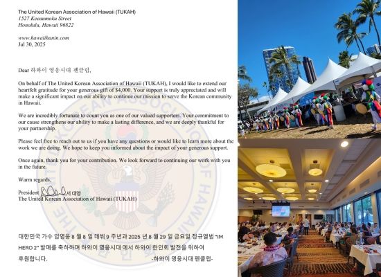최근 임영웅 팬클럽 '하와이 영웅시대'는 가수의 데뷔 9주년(8월 8일)과 2집 앨범 발매(8월 29일)를 기념해 지난 30일 하와이 한인회에 미화 4,000달러를 기부했다고 밝혔다.