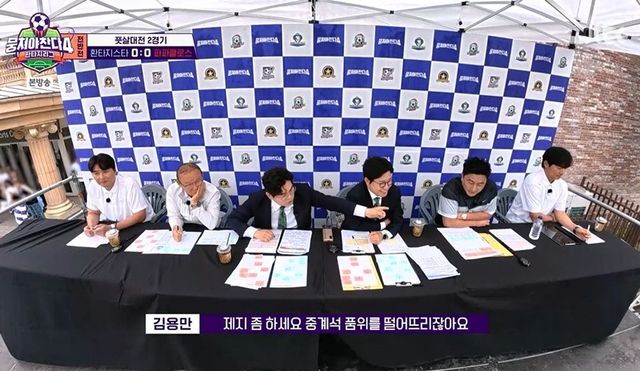 이어 오재현도 절호의 찬스를 놓쳤고, 안정환은 “머리띠 빼”라고 심통을 부렸다. 이에 김용만은 “제지 좀 하세요. 중계석 품위를 떨어뜨린다”라고 했고, 안정환은 “죄송하다. 안타까운 마음에”라며 오재현을 격려했다.