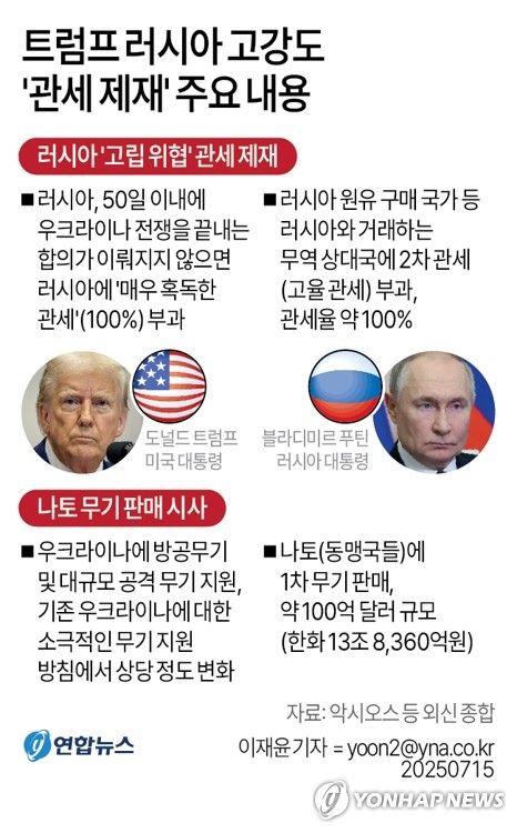 앞서 트럼프 대통령은 우크라전쟁 휴전 협상이 지지부진하자 지난달 14일 50일 안에 우크라이나 전쟁 종전 합의를 하지 않을 경우 러시아에 혹독한 관세를 부과하고, 러시아와 교역하는 국가에도 100% 정도의 '2차 관세'를 부과할 것이라고 경고했다.