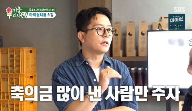 그러자 김준호는 “축의금 가격별로 주자”라고 제안했고, 이를 들은 김지민은 “양아치세요?”라고 당황했다. 김준호는 “양아치가 아니고 베네핏을 줘야죠”라면서 “유지태도 괜찮게 냈다. 권상우 해줘야 해. 집에 선물도 보냈다”라면서 “손현주 형은 너한테 했지. 전화해서 따졌더니 넌 돈을 막 쓸 것 같다더라. 차태현 3만 원은 잊을 수 없다”라고 서운해했다.