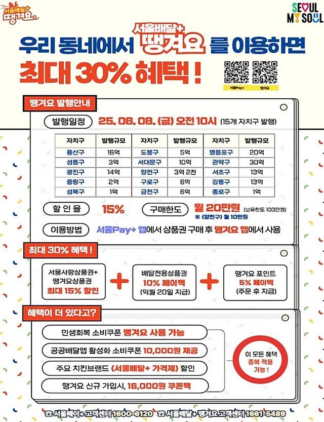 서울시에 따르면 이번 배달전용상품권은 15개 자치구를 대상으로 발행되며, 서울페이플러스(서울Pay+) 앱을 통해 구매 가능하다. 1인당 월 20만 원까지 살 수 있고, 보유 한도는 100만 원이다. 단, 양천구는 월 10만 원으로 제한된다.