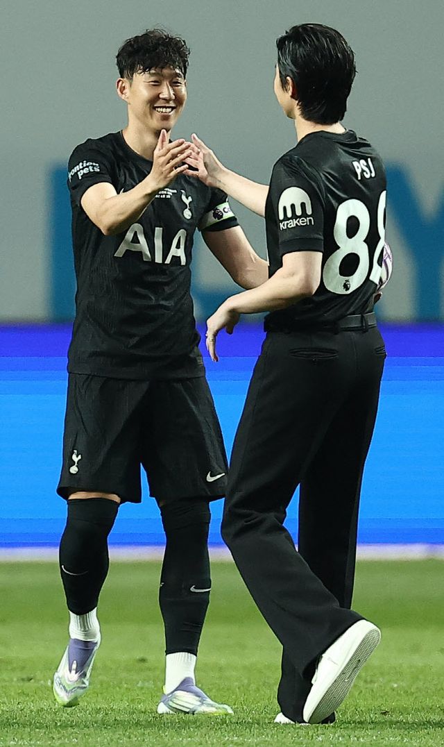 이날 킥오프 전 시축은 손흥민과 절친한 사이인 배우 박서준이 맡았다. 그는 마이크를 잡고 “손흥민 선수의 긴 토트넘 여정에 밤잠을 많이 설쳤다”며 “즐거웠고 감사하고 행복했다”고 말했다. 박서준의 시축이 끝나자, 손흥민은 포옹하며 고마움을 전했다.