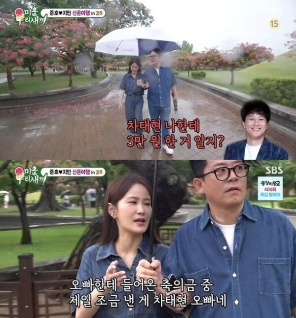 이때 김준호는 "그런데 차태현 나한테 3만 원 한 것 알지?"라며 절친 차태현의 축의금 액수를 폭로했다. 이에 김지민은 "나머지 금액은 나한테 한 거 알지"라며 따로 축의금을 받았음을 밝혀 김준호를 머쓱하게 했다.