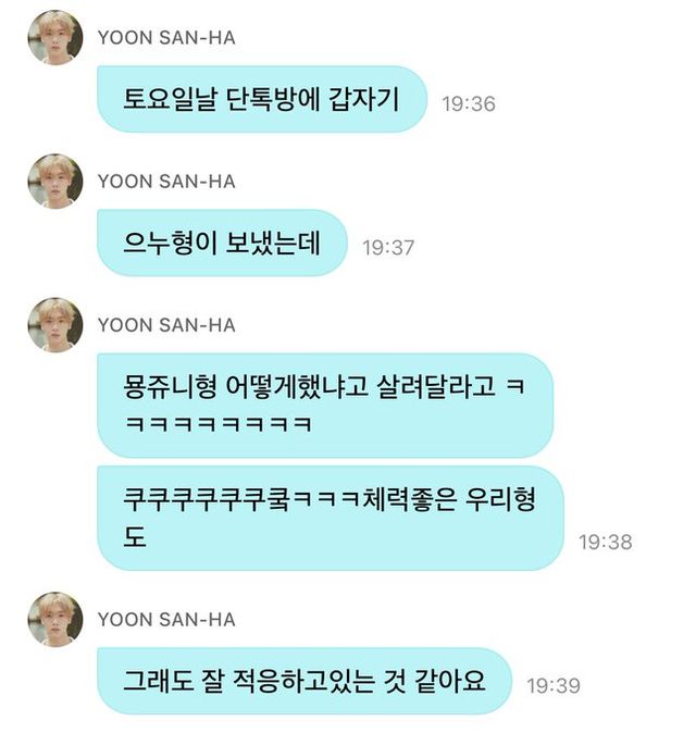윤산하는 지난 3일 팬 소통 플랫폼을 통해 "토요일날 단톡방에 갑자기 은우 형이 '묭쥬니(MJ) 형 어떻게 했냐고, 살려달라고 하더라"라며 차은우의 군 적응기를 전했다.