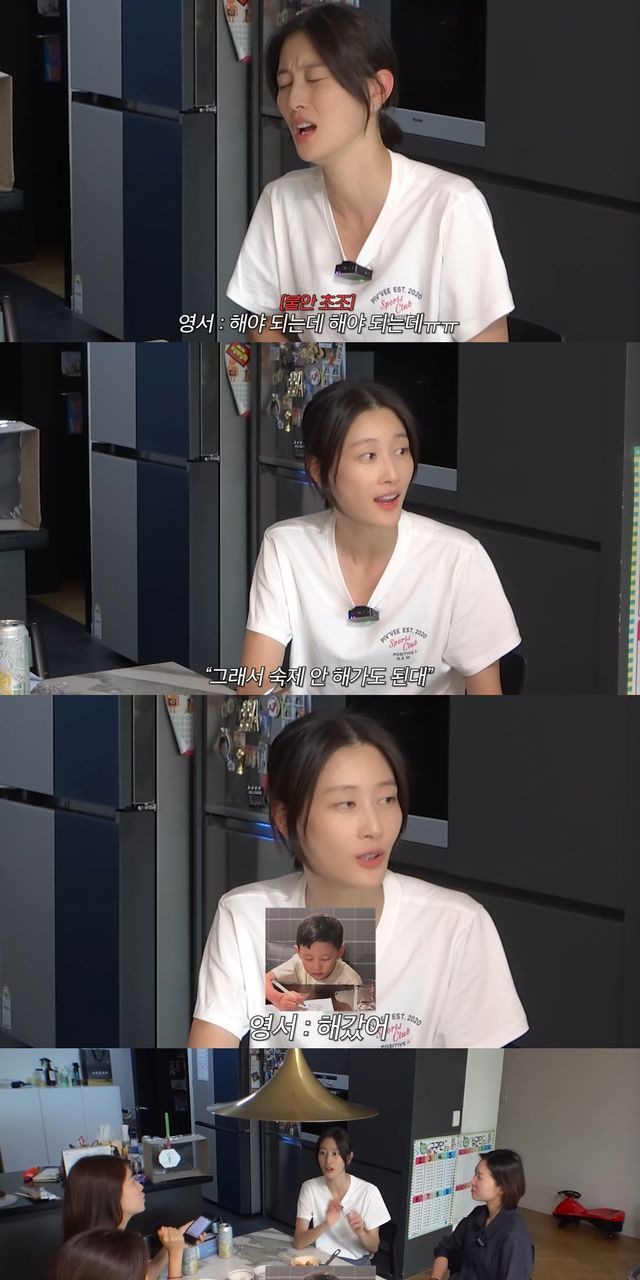 이현이는 "영서는 유치원에서 시켜서 숙제를 하는데 지난 주에 아팠다. 목요일 금요일부터 일요일까지 아팠다. 유치원 숙제가 목, 금, 토, 일 다 밀린 거다. 하지말라고 하니 스트레스를 받더라"고 전했다.