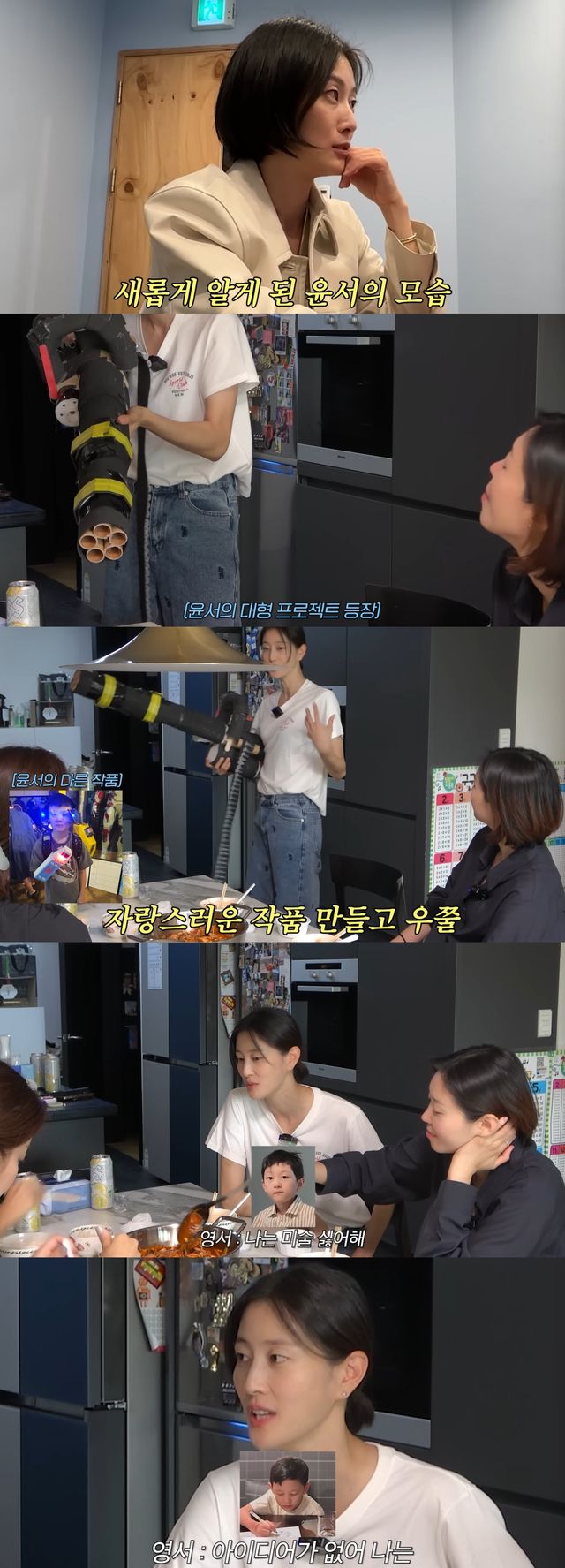 이어 아들이 만들어온 바주카포를 자랑했다. "이걸 3주 만에 만들어서 왔다. 자랑스러워하더라"고 전한 이현이는 "영서(둘째 아들)는 다녀보라니까 미술을 싫어한다고 안 간다더라. 싫다는데 그냥 상담 등록을 했다. 같이 보내면 좋지 않나"라고 운을 뗐다.