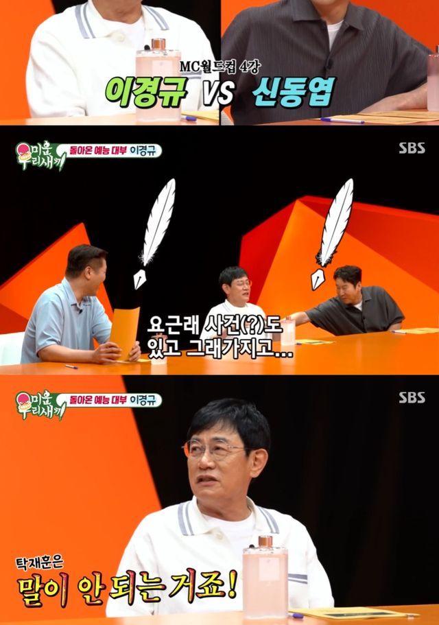 그 와중 신동엽은 "그런 일이 있긴 했지만 (상대로) 탁재훈은 좀 그런 거냐"고 다시 한 번 물었고 이경규는 "말이 안 되는 거다"라며 버럭해 눈길을 끌었다.