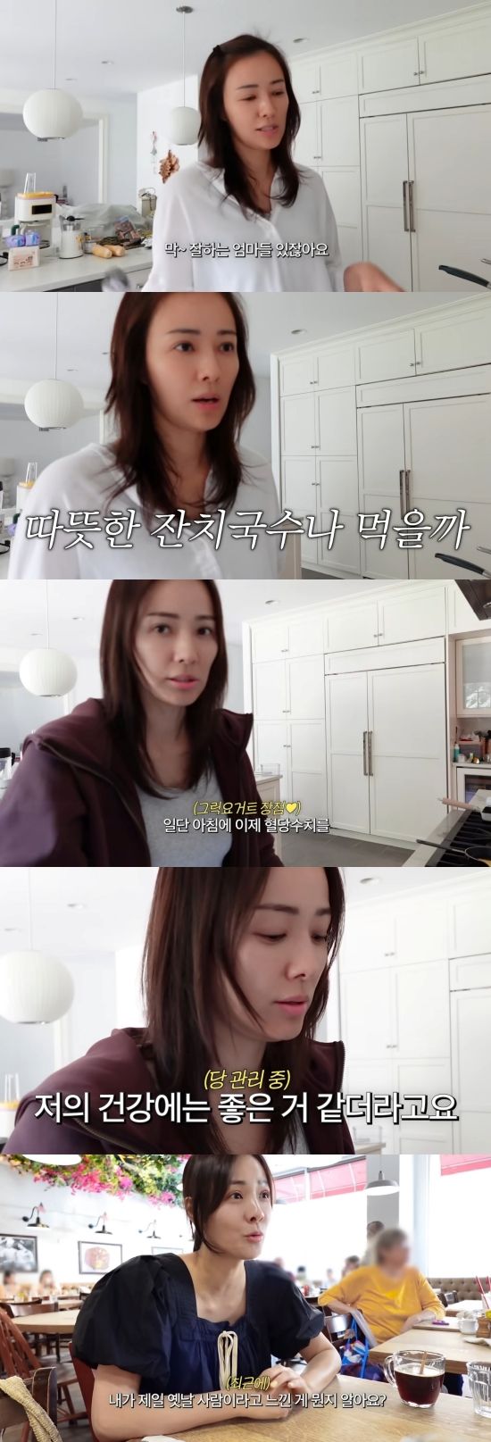 결국 이날 손태영은 잔치국수로 딸과 한 끼를 해결했고 간단하게 저녁도 해결했다. 다음 날 아침으로 그릭요거트를 거낸 손태영은 "아침에 혈당 수치를 안 올리니까 건강에 좋은 거 같다"라고 당을 관리하는 근황을 전했다.