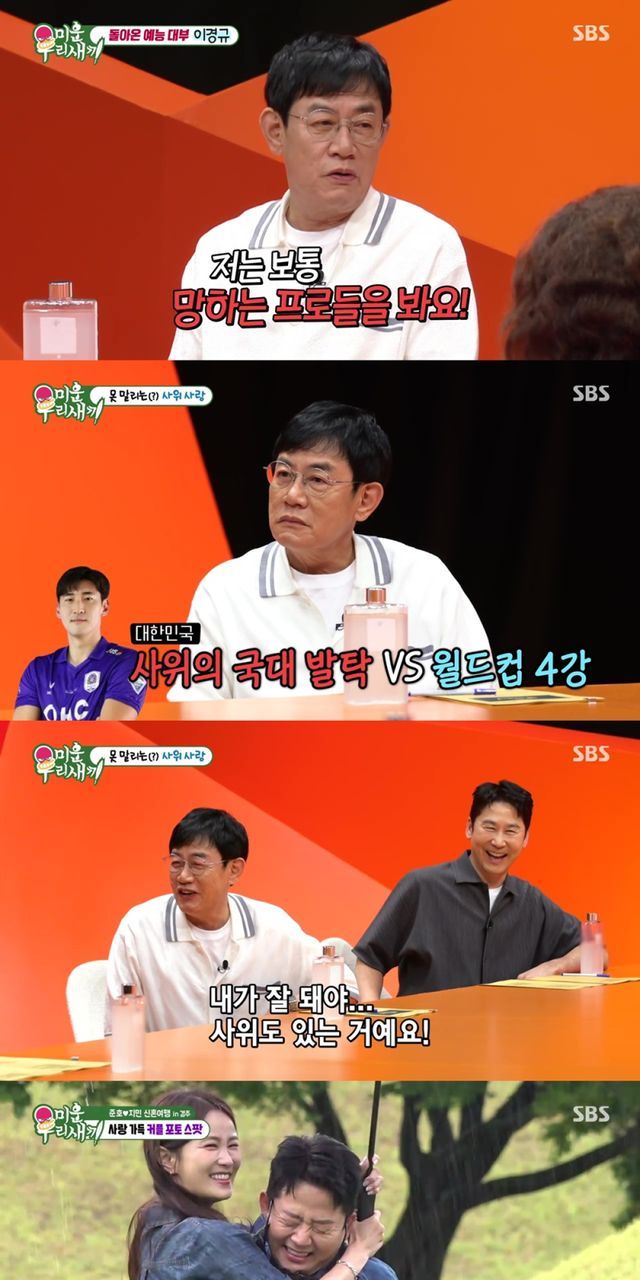 3일 방송된 SBS ‘미운 우리 새끼’에 스페셜 MC로 출연한 이경규는 특유의 입담을 선보이며 눈길을 끌었다. 그는 평소 방송을 잘 보지 않는다며 “망하는 프로그램을 보며 자신감을 채운다”고 밝혀 웃음을 자아냈다. 이어진 최애 MC 월드컵에서 이경규는 유재석과 신동엽의 결승전에서 신동엽을 최종 선택하며 “제가 어디에 와 있냐”며 센스를 발휘했다.