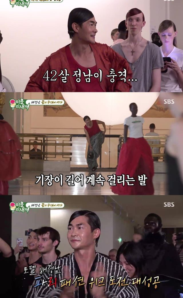 한편, 이날 방송에서 배정남은 파리 패션쇼에 처음으로 도전하는 모습으로 화제를 모았다. 배정남은 이상민과 함께 파리에 도착해 헤어스타일부터 왁싱까지 철저히 준비했지만, 리허설에서 동선이 꼬이고 긴 바지를 계속 밟으며 크게 당황했다. 심지어 후배 모델이 그의 나이를 ‘50살’로 오해하는 굴욕까지 당했다. 그러나 배정남은 본 쇼에서 긴장감을 극복하고 자신감 넘치는 눈빛과 능숙한 워킹을 선보이며 무대를 성공적으로 마쳤고, 어머니들은 그의 프로다운 면모에 박수를 보내며 감탄을 자아냈다.
