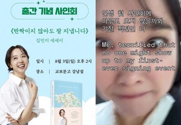 사인회에 앞서 그는 "인생 첫 사인회에 아무도 오지 않을까봐 기절 직전인 나"이라는 글과 함께 긴장한 표정의 사진을 올리기도 했다.