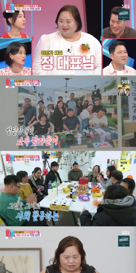 이날 방송에서는 정은혜♥조영남 부부가 자신의 일터를 소개했다. 14명의 발달장애인 소속 작가들이 그림도 그리고 사회활동을 하는 예술노동자 창작공간이었다. 정은혜가 이곳의 대표라고.